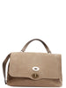 Zanellato - Borsa a mano Postina Jones Medium in pelle tortora effetto scamosciato con lati impreziositi da borchie oro, manico singolo, tracolla in pelle tono su tono, sul davanti patta e chiusura con gancio, interno foderato, da poter indossare come borsa a tracolla.