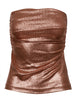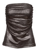 Top a fascia laminato con riflessi metal, senza spalline, arricciature laterali, senza chiusure, tessuto elastico, fondo nero, riflessi argento e bronzo, vestibiltà regolare.