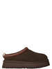 UGG - Scarpe slippers Tazz in suede sabbia con imbottitura in lana tono su tono, punta tonda e piccolo logo ricamato, ricamo rosso e beige sui bordi, tirante sul retro, para alta in gomma, senza chiusure, vestibilità piccola.